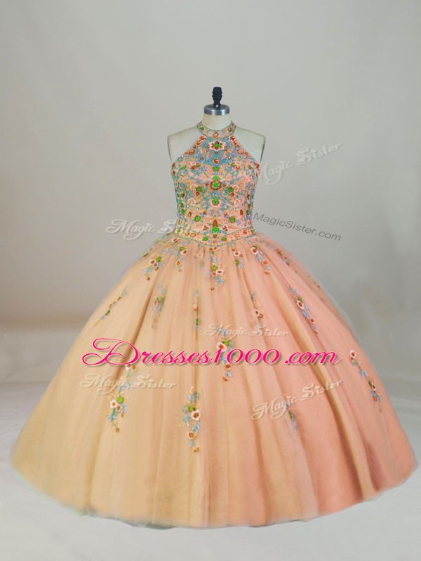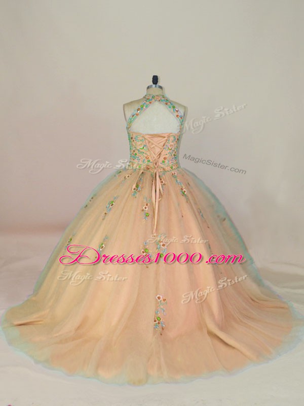 Noble Appliques and Embroidery Vestidos de Quinceanera Peach Lace Up Sleeveless Brush Train