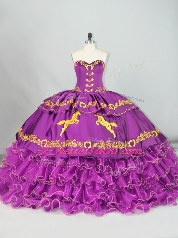 Purple Ball Gowns Satin and Organza Sweetheart Sleeveless Embroidery and Ruffles Lace Up 15th Birthday Dress Brush Train