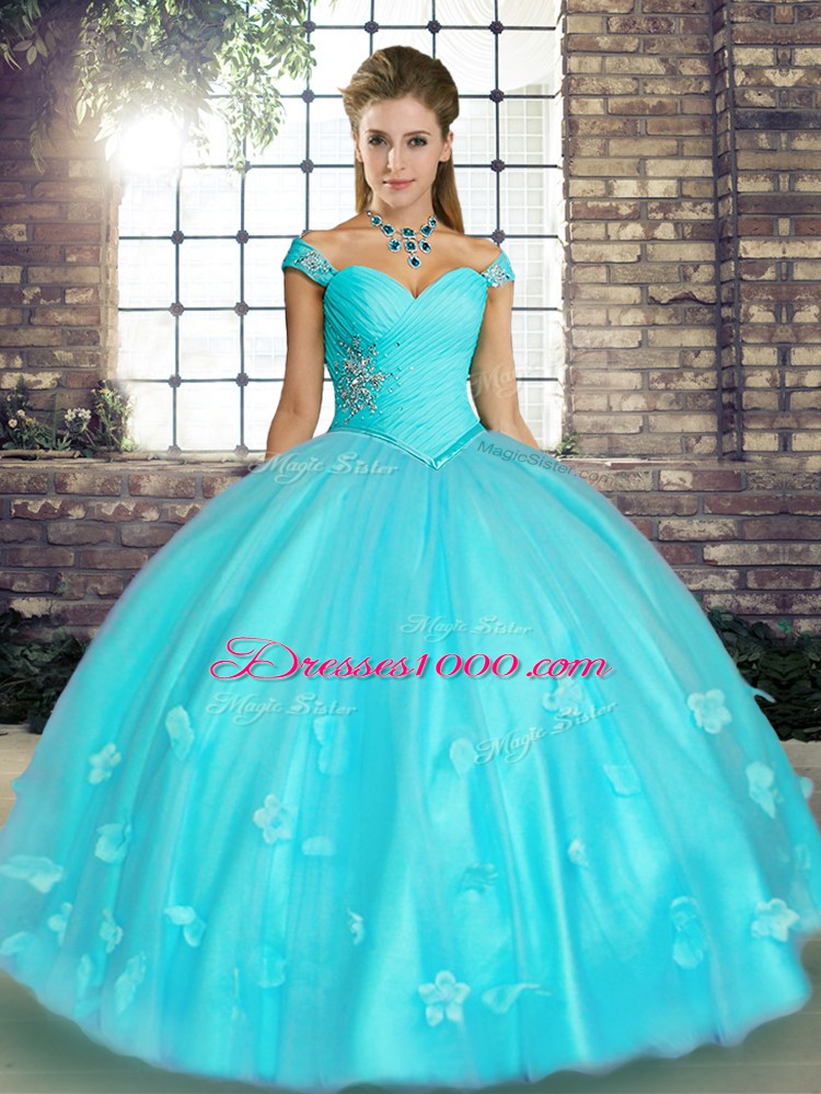 Aqua Blue Off The Shoulder Neckline Beading and Appliques Vestidos de Quinceanera Sleeveless Lace Up