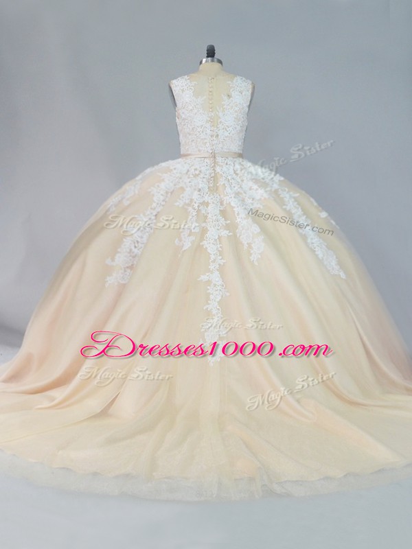 Scoop Sleeveless Court Train Zipper Quinceanera Gown Champagne Tulle