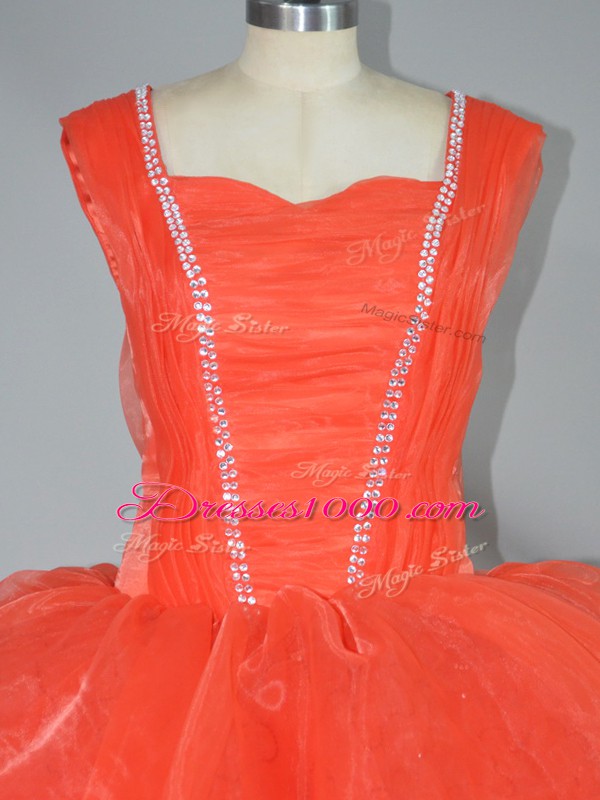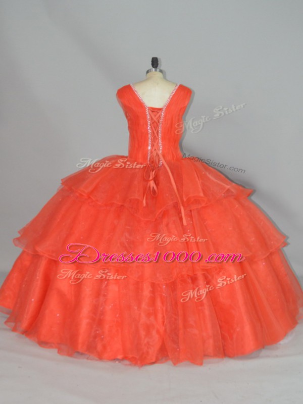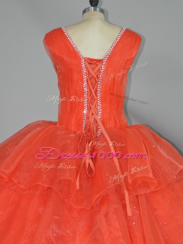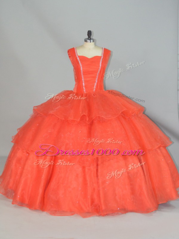 Lovely Organza Straps Sleeveless Lace Up Beading and Ruffled Layers Quinceanera Dresses in Orange Red