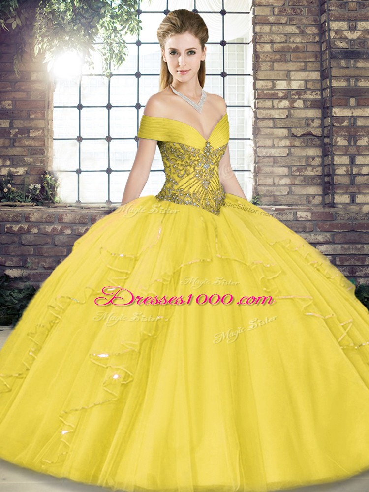 Gold Ball Gowns Tulle Off The Shoulder Sleeveless Beading and Ruffles Floor Length Lace Up Quinceanera Gowns