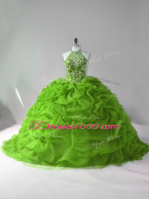 Low Price Organza Halter Top Sleeveless Court Train Lace Up Beading and Pick Ups Quinceanera Dresses in Green