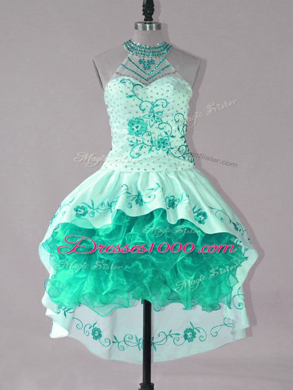 Stylish Turquoise Lace Up Strapless Embroidery and Ruffles Dress for Prom Satin and Organza Sleeveless