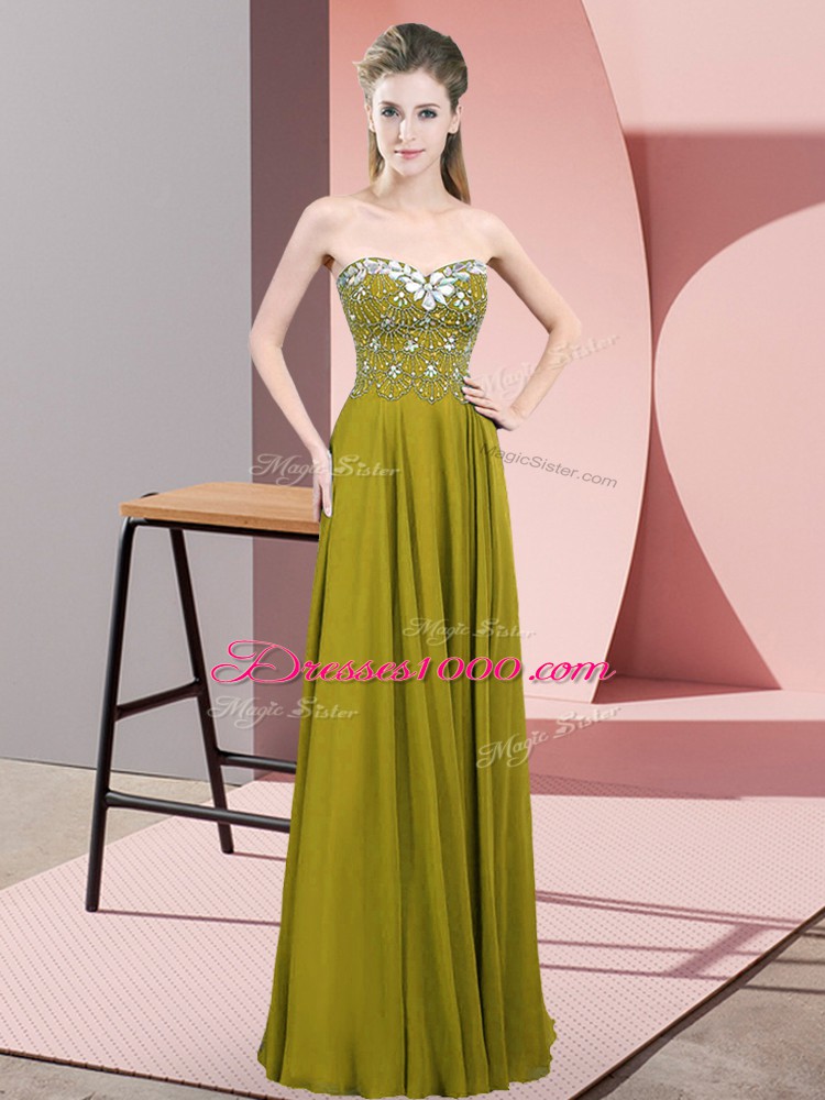 Olive Green Empire Beading Teens Party Dress Zipper Chiffon Sleeveless Floor Length