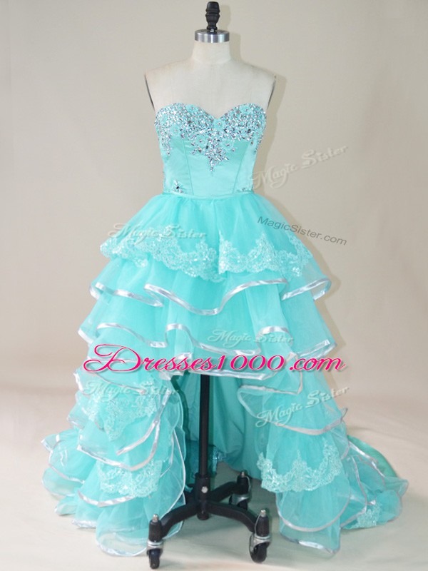 Smart Aqua Blue Sleeveless Beading and Lace and Ruffled Layers High Low Pageant Dress for Girls