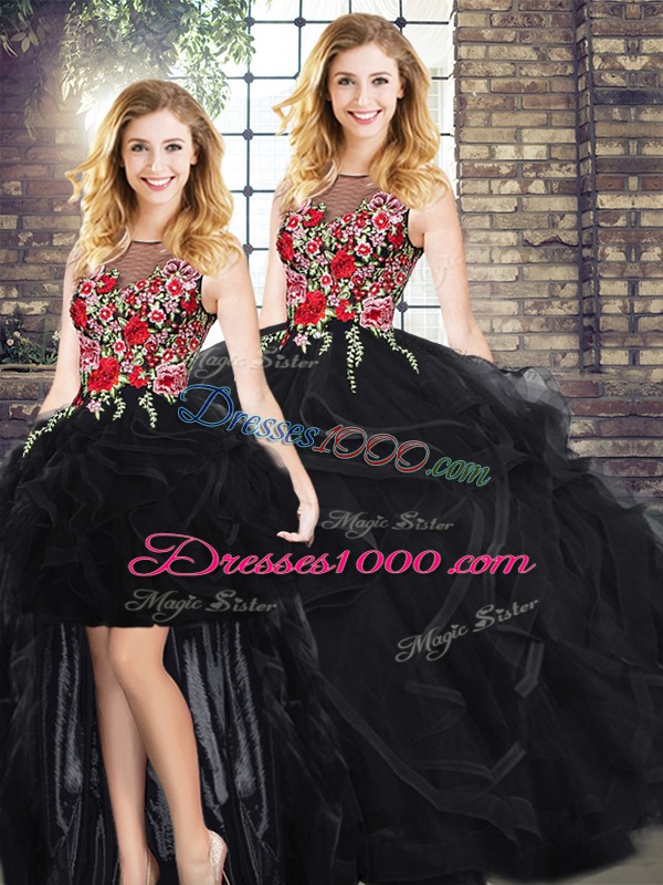 Black Zipper Quince Ball Gowns Embroidery and Ruffles Sleeveless Floor Length