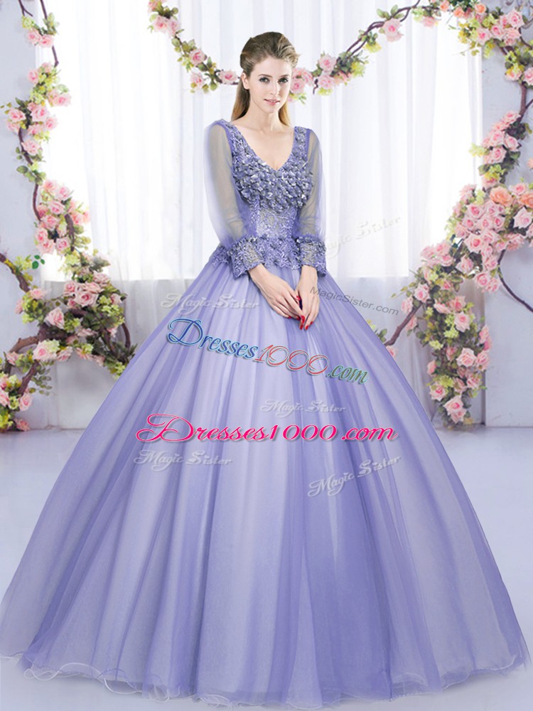 Traditional Lavender V-neck Neckline Lace and Appliques Quinceanera Gown Long Sleeves Lace Up