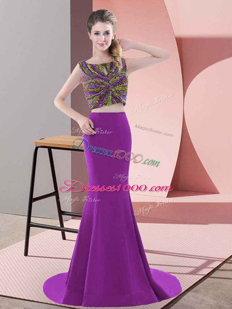 Scoop Sleeveless Evening Gowns Sweep Train Beading Purple Satin