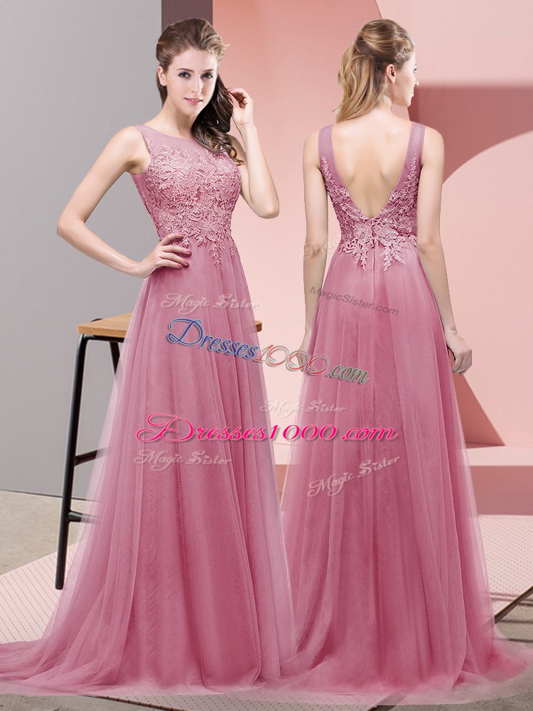 Clearance Scoop Sleeveless Tulle Evening Dress Lace Sweep Train Lace Up
