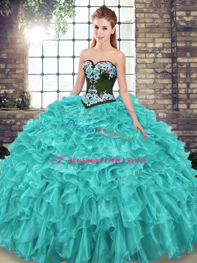 Luxury Sweetheart Sleeveless Sweet 16 Quinceanera Dress Sweep Train Embroidery and Ruffles Turquoise Organza