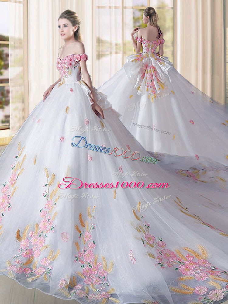 Cathedral Train Ball Gowns Vestidos de Quinceanera White Off The Shoulder Tulle Sleeveless Lace Up