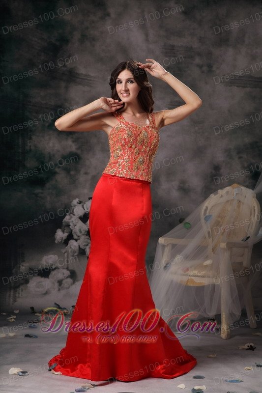 Red Mermaid Beaded Straps Prom Evening Dress Satin