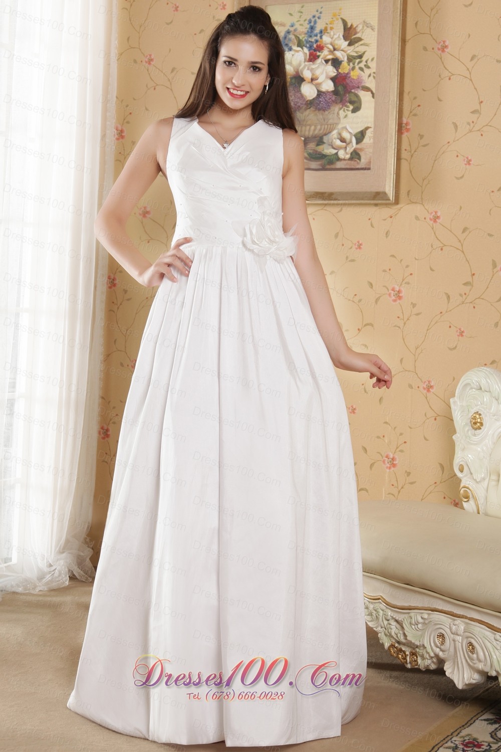 Show your fun and chic in this floor-length wedding dress! This white taffeta dress features with v-neck with some little cute beading trimed the bodice and a hand made flower on the left waist highlights this dress. The simple skirt flows beautifully with a loose fit that will make it easy to dance the night away. The zipper up back with a nice hand-made flower will make the dress beautiful yet fit you better.