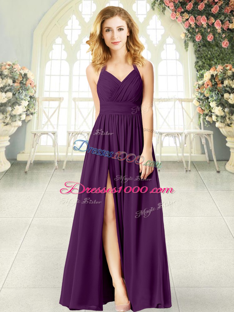 Sleeveless Chiffon Floor Length Backless Evening Outfits in Purple with Ruching