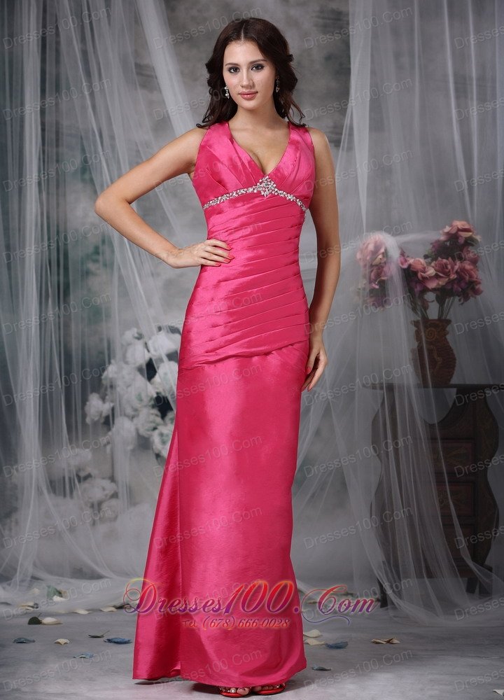 Hot Pink Column V-neck Taffeta Beading Prom Dress