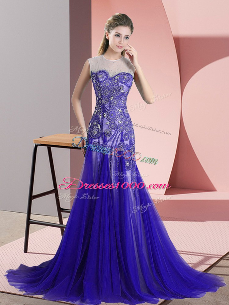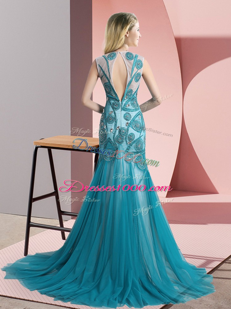Tulle Sleeveless Womens Evening Dresses Sweep Train and Beading and Appliques