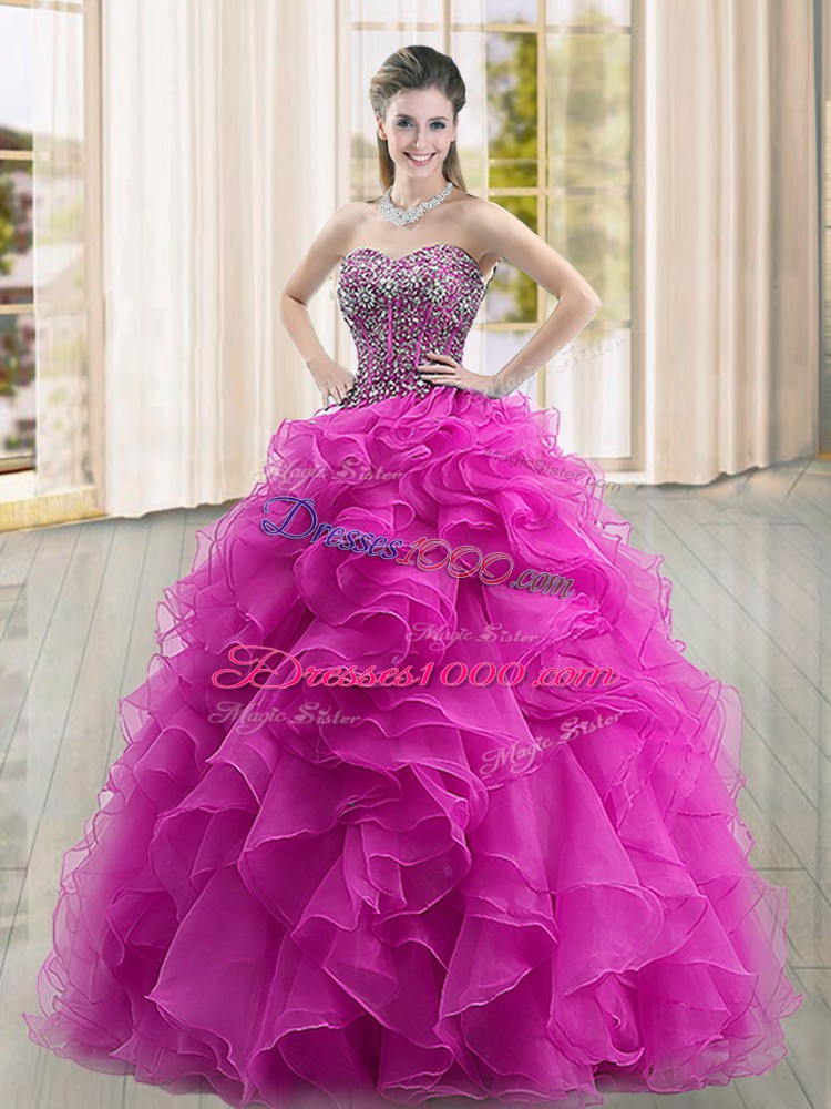Sweetheart Sleeveless Quinceanera Gown Floor Length Beading and Ruffles Fuchsia Organza