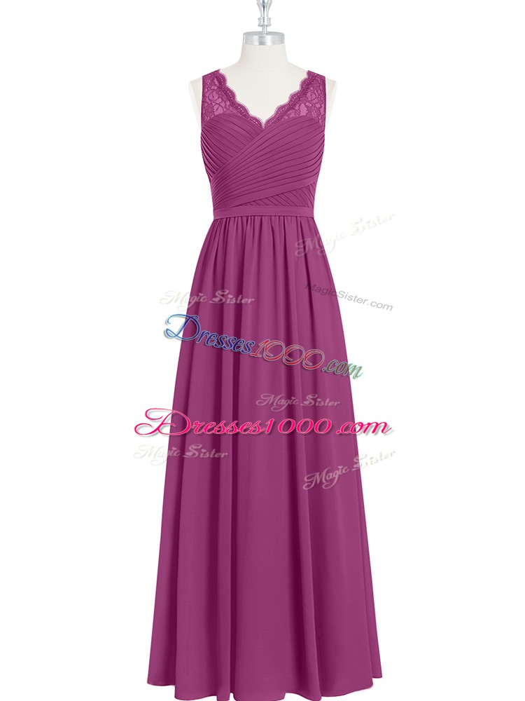 Fuchsia Empire Chiffon V-neck Sleeveless Lace and Ruching Floor Length Backless Formal Dresses