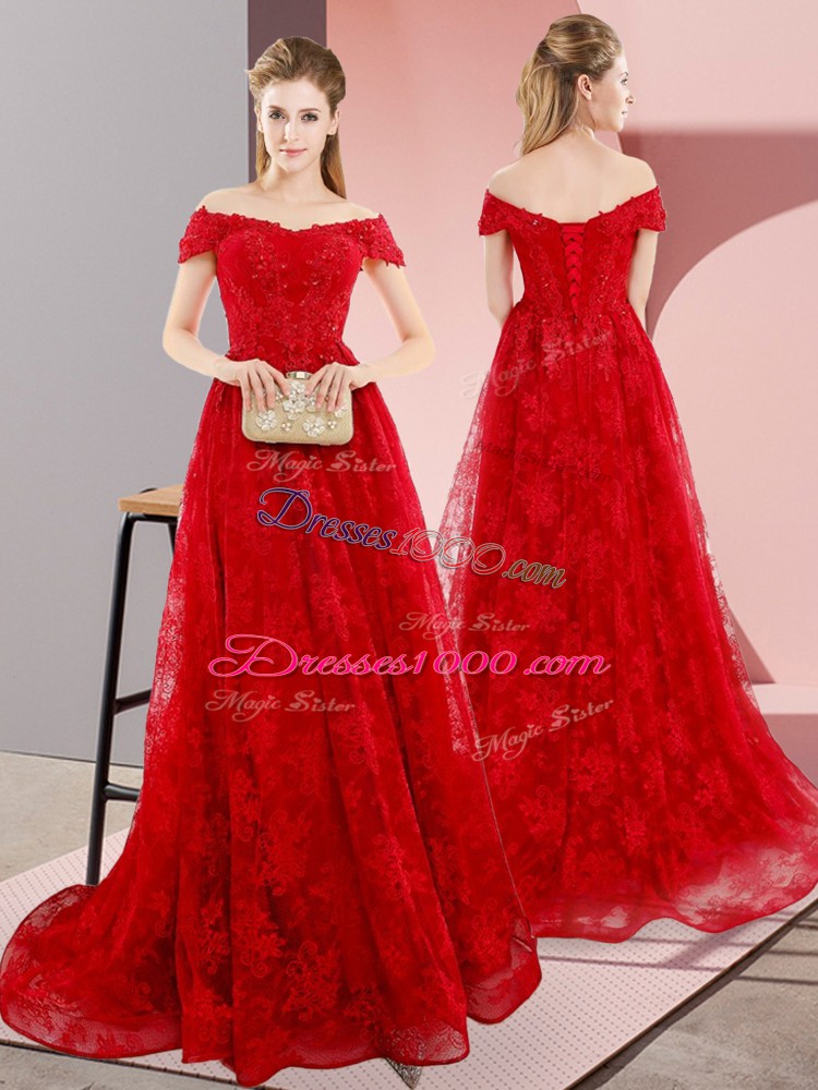 Lovely Red Off The Shoulder Lace Up Beading and Lace Formal Dresses Sweep Train Sleeveless