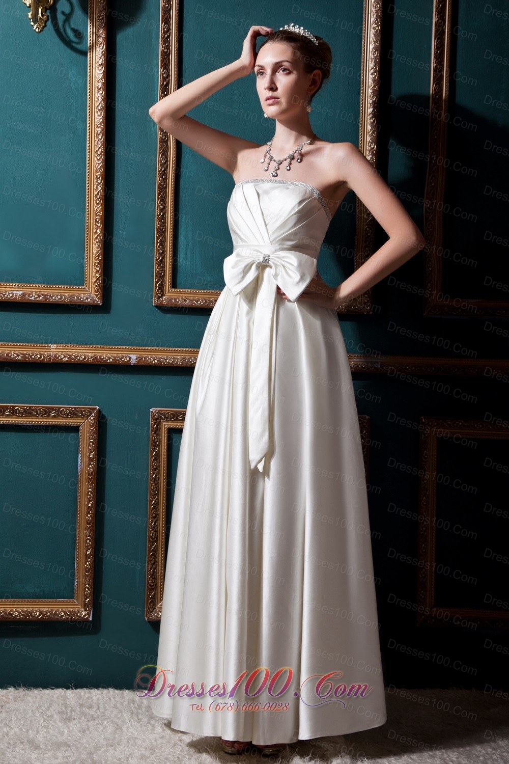 Elastic Wove Satin Beading and Bows Wedding Bridal Gown Strapless