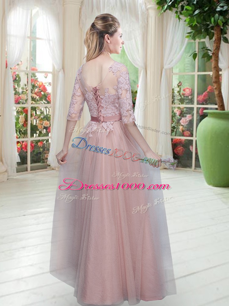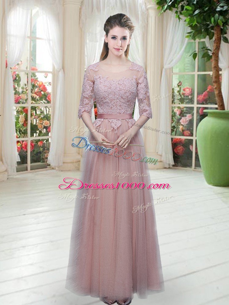 Cheap Half Sleeves Floor Length Lace Lace Up Evening Outfits with Pink