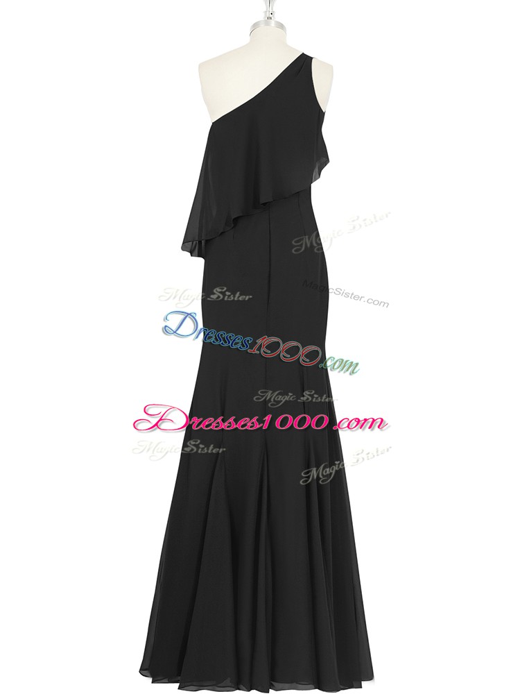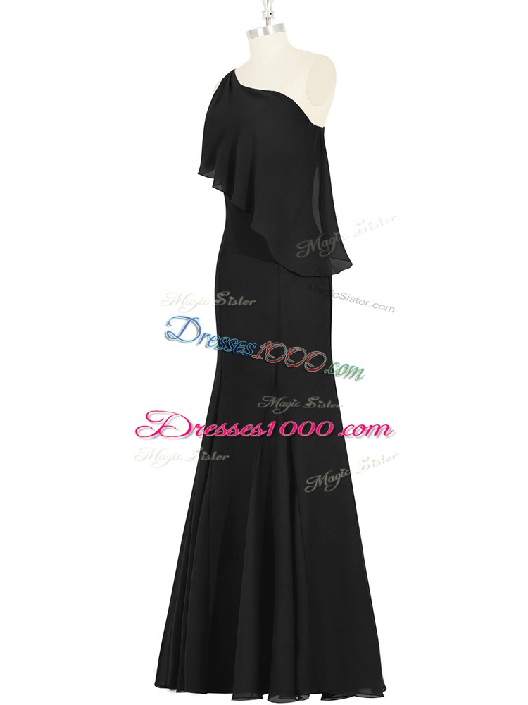Modest Black Chiffon Side Zipper One Shoulder Sleeveless Floor Length Evening Party Dresses Ruching
