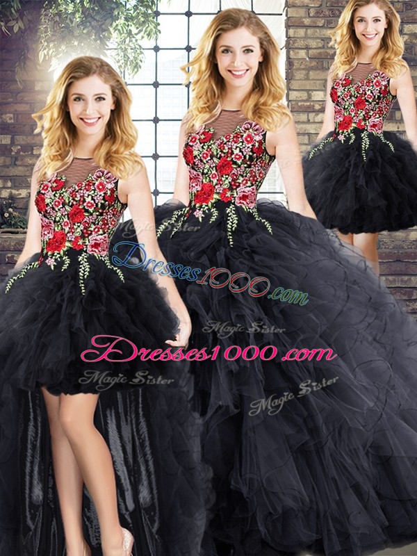 Black Zipper Scoop Sleeveless Floor Length Quinceanera Gown Embroidery and Ruffles
