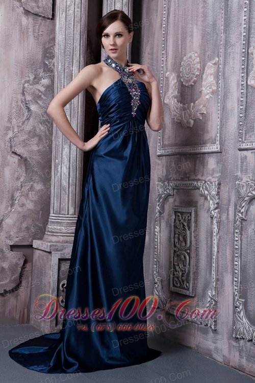 Show off your sophisticated side in this navy blue elegant taffeta prom dress! The figure-hugging bodice features a halter top neck entirely embellished with rhinestones and beadings which extend to the upper waist area. With a ruched bodice, this floor length skirt hugs your figure and flows naturally with a sweet train in the back. You're surely to love it.