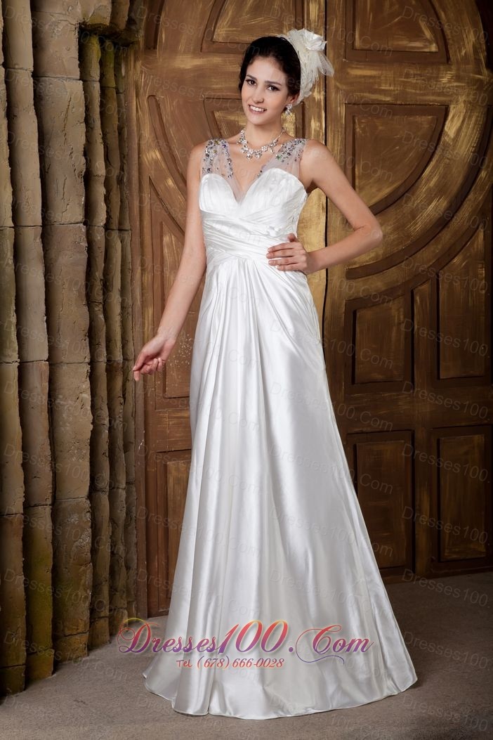 V-neck Straps Elastic Woven Satin A-line Beaded Wedding Gown