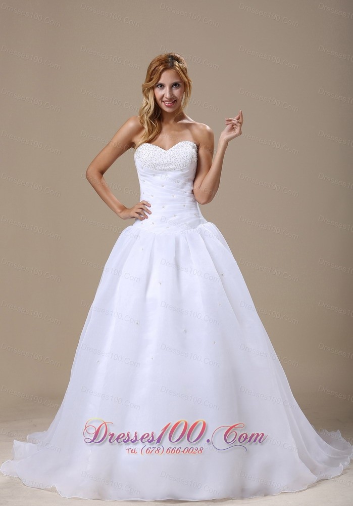 Sweetheart Beaded Ruched Organza Wedding Dress Court Train