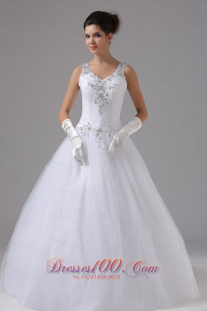 Appliques Decorated Straps Ball Gown Tulle Wedding Dress