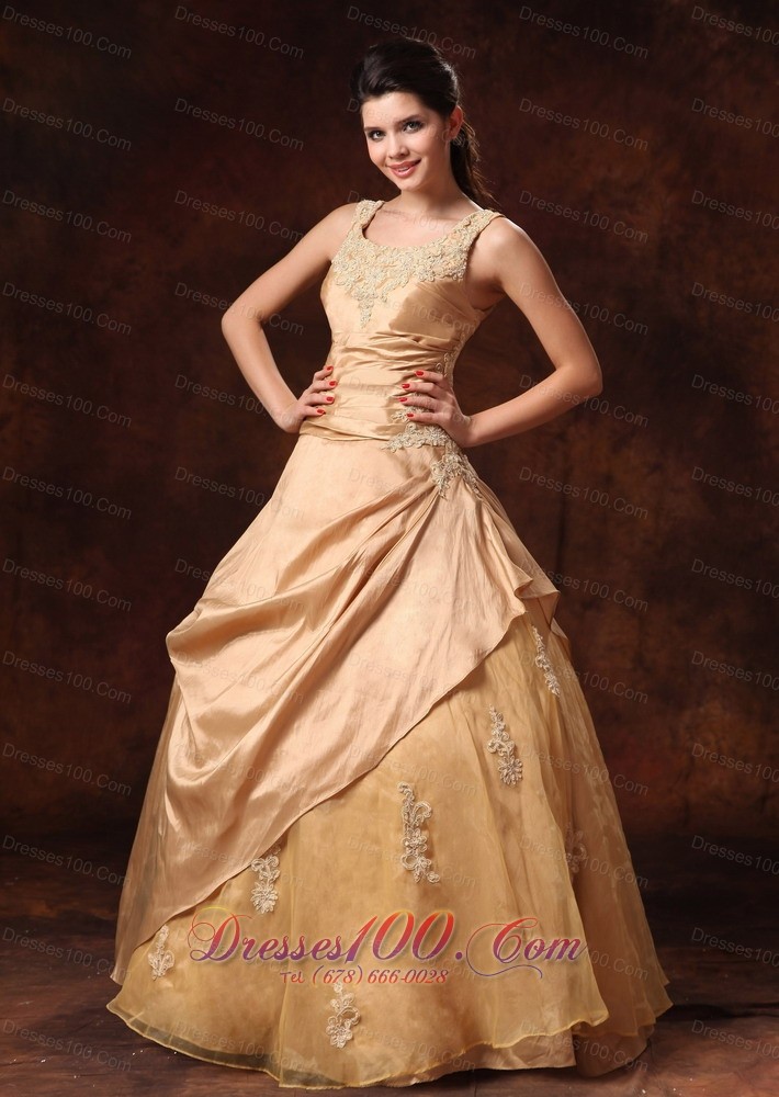 Champagne Taffeta Organza Straps Appliques Bridal Dress Scoop