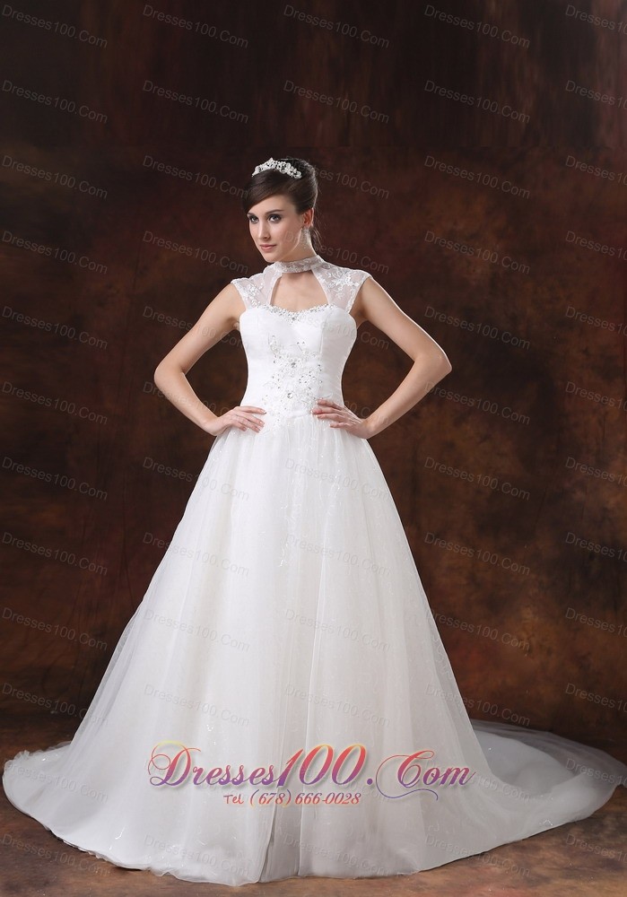 Organza High Neckline Bridal Dress With Appliques Decorate