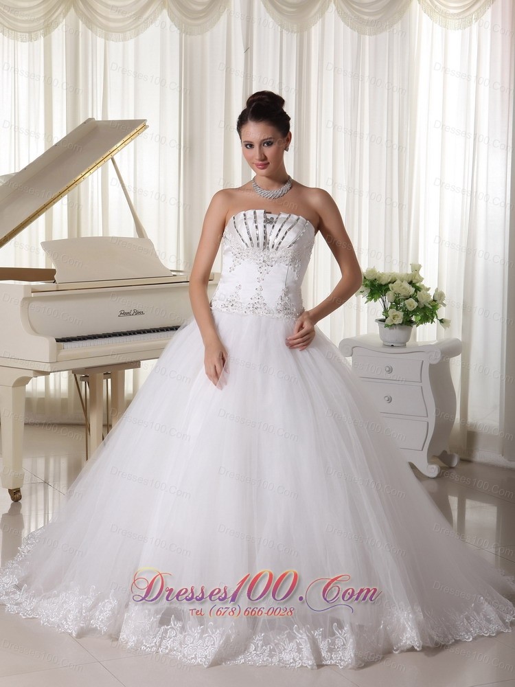 Strapless Satin and Tulle Beaded Sweep Train Bridal Gown