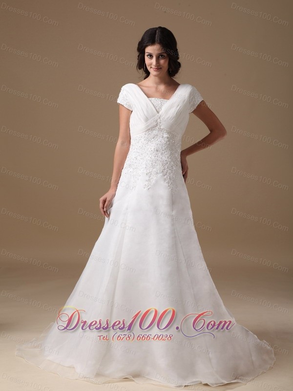 Organza and Taffeta Wedding Gown V-neck Appliques Court Train