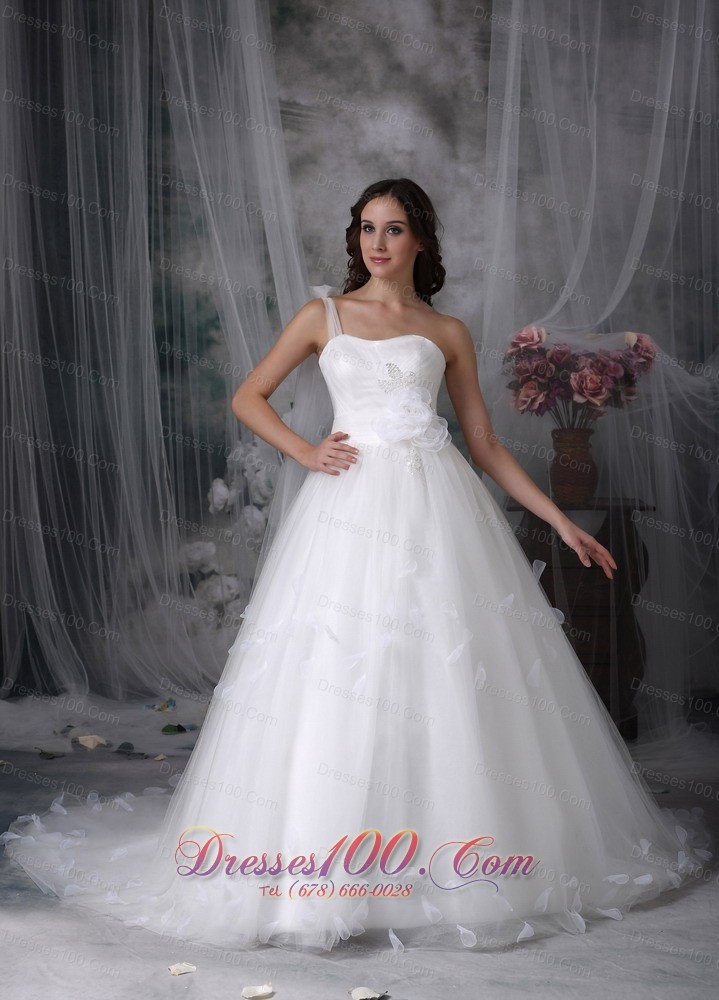 One Shoulder Beaded Bridal Dress Tulle Handle Flowers Watteau Train
