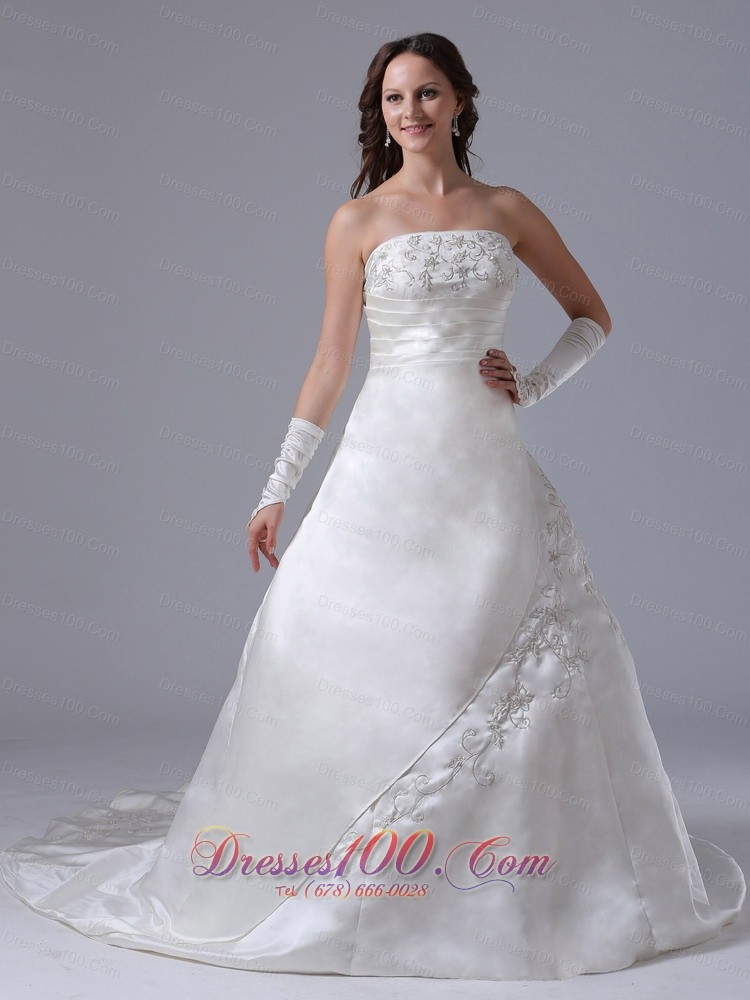 Strapless Embroidery Wedding Gown Ruched A-line Court Train