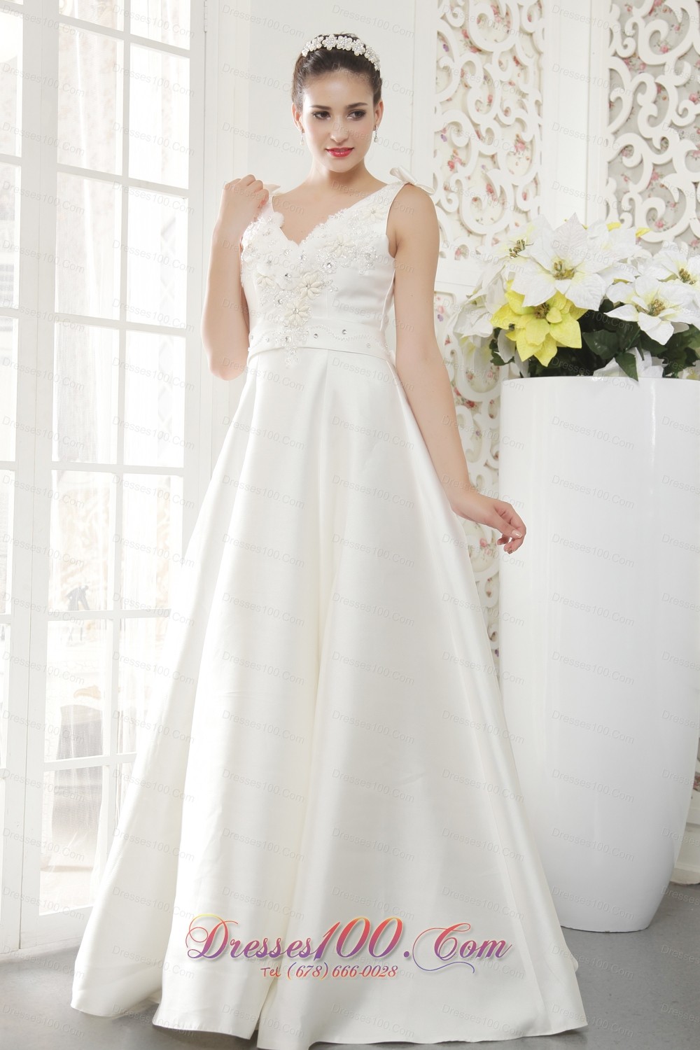 If you're looking for a traditional style wedding gown, this one takes the cake! It has a lovely straps bodice with a V-neckline and pretty bows on the top shoulder. Several floral appliques adorn the upper bodice of the dress, just above the waistline of the skirt. The skirt is full made of satin that's been embellished with beaded appliques. A hidden zip closure avove a pretty bow in the back completes the design.