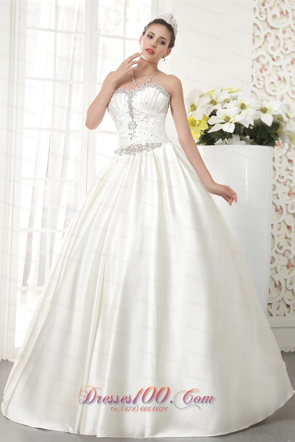 Stunning and sophisticated are two words to perfectly describe this white wedding dress. The elegant bodice with a sweetheart neckline features intricate beadwork and exquisite ruching decorations. The full A-line satin skirt is pure with no redundant, and an adjustable lace up in the back completes this unique design. You are sure to be the most beautiful bride.