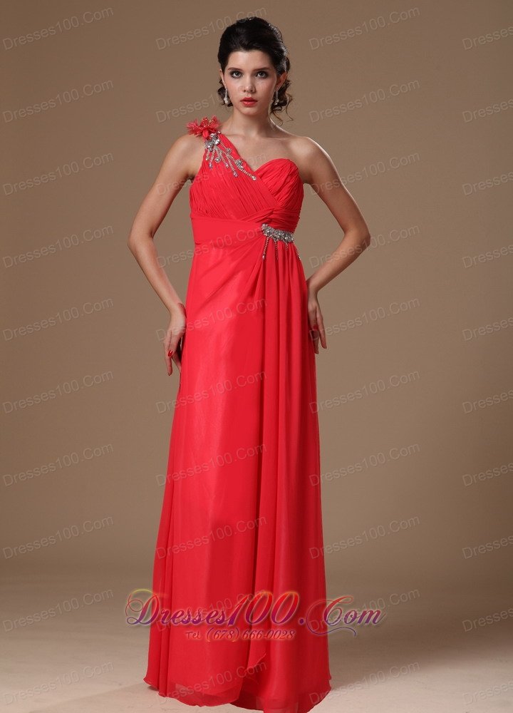 Beaded One Shoulder Coral Red Empire Prom Dress
