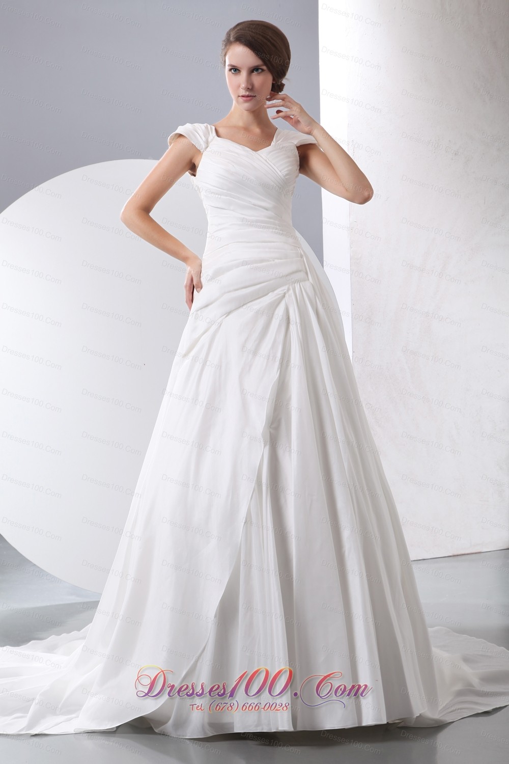 V-neck Ruch Wedding Dress Chapel Train Taffeta