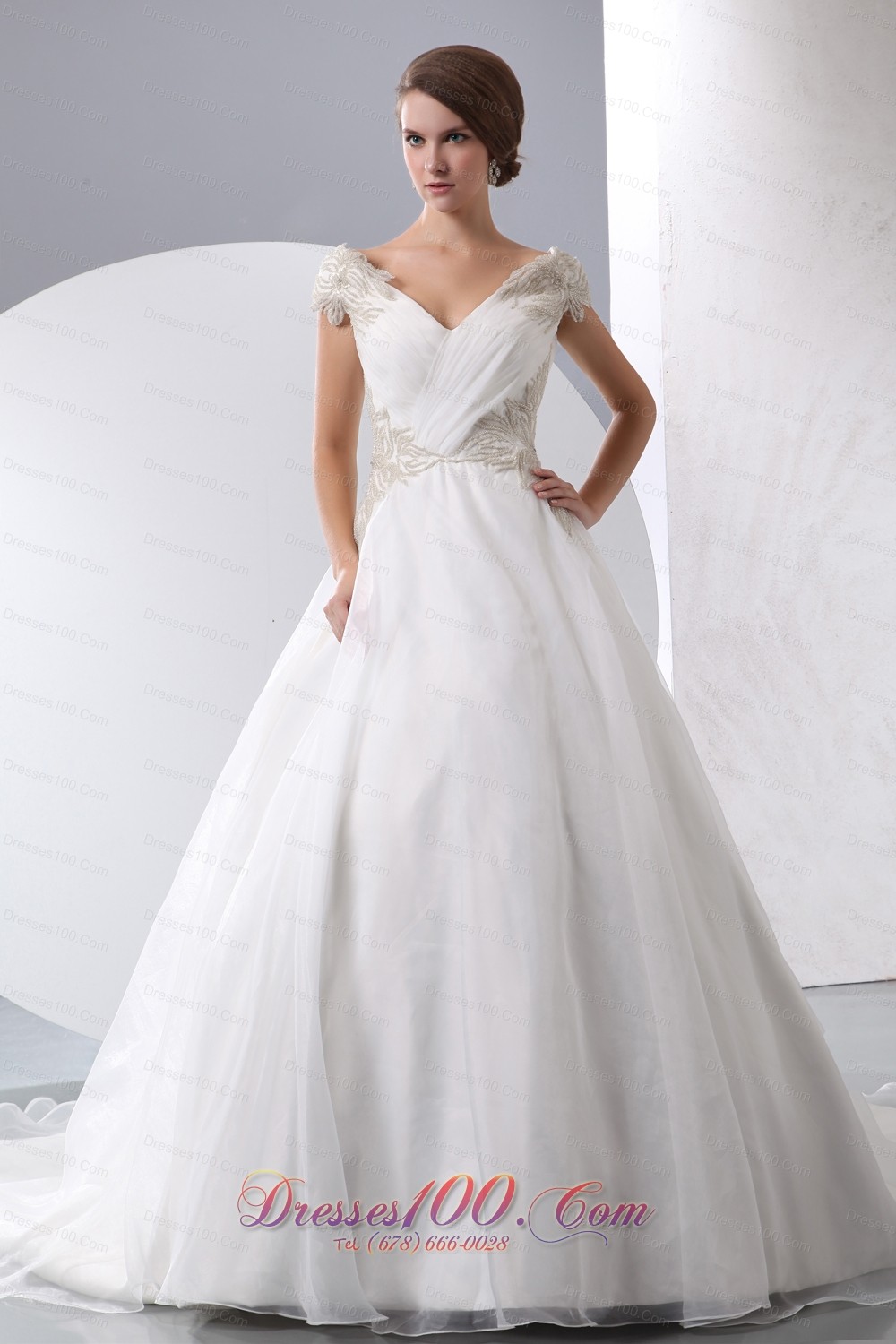 A-line Wedding Gown V-neck Beaded Chapel Train