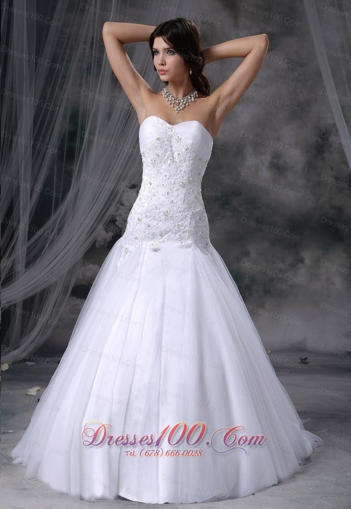 This is a fabulous wedding gown will ensure that princess moment on your day. The strapless dress has a subdued sweetheart shape and laced embellishments throughout the bust. The stunning and sophisticated lace embroidered accents are really eye-catching which strech into the hip and the back. The organza A-line skirt falls freely to the floor extending a sweep train that adds more elegance. A corset-style closure secures the dress in place and ensures a great fit.