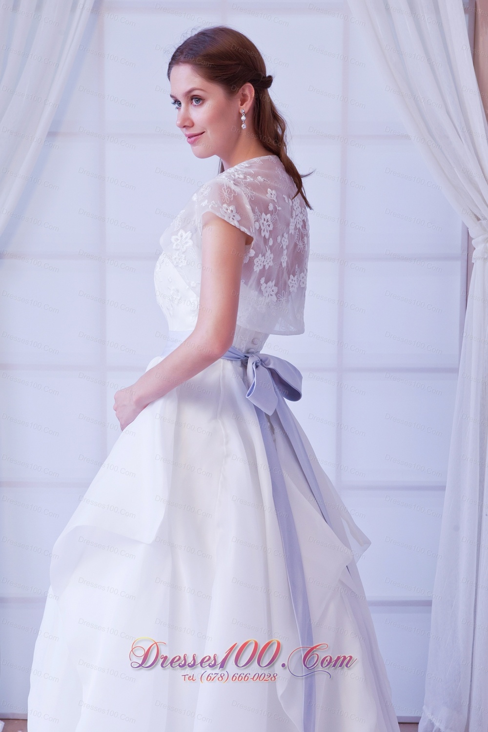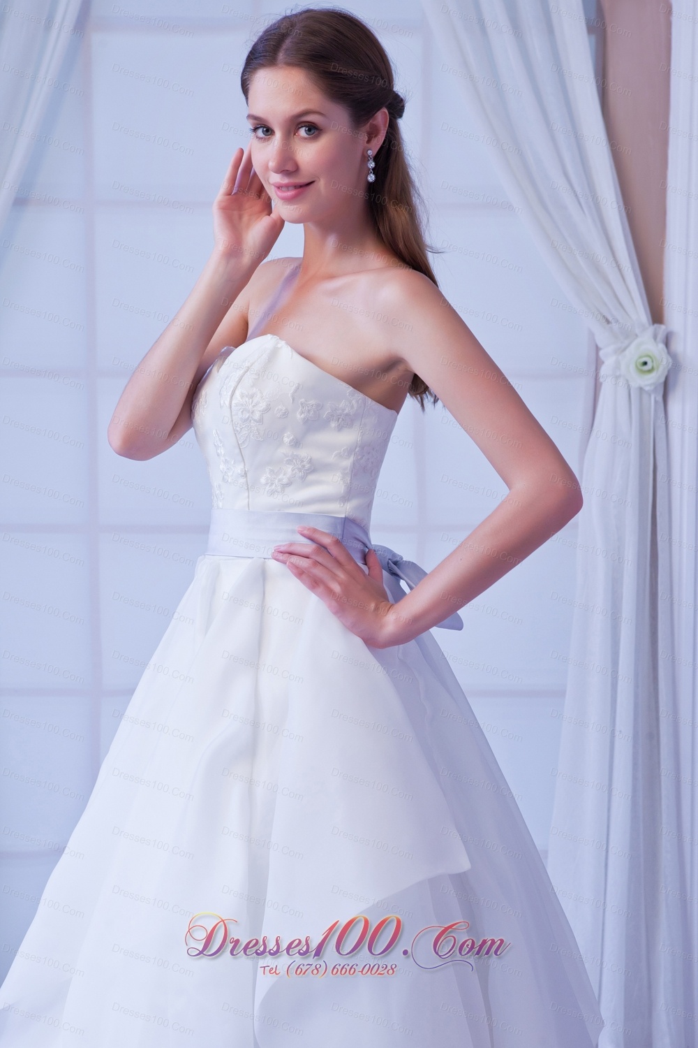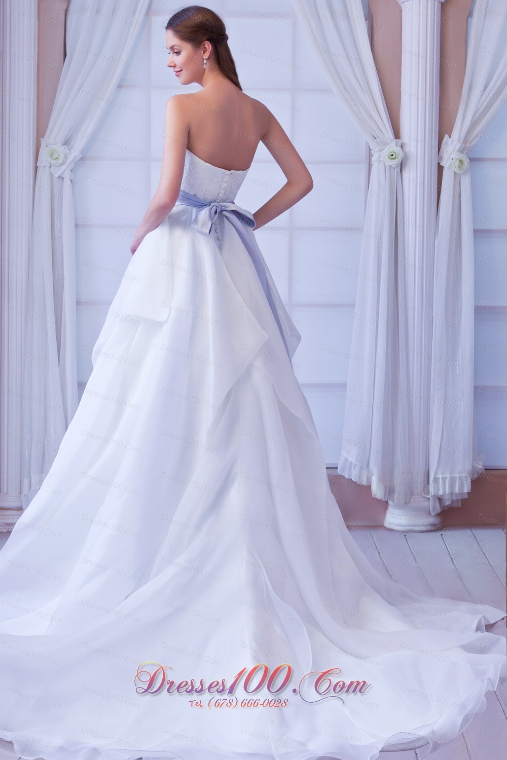 This A-line gown is everything that you've ever dreamed of a wedding dress could be! The notable dress creates a touching effect which makes you the hotline. It features a fitted corset bodice with appliques and a lovely sweetheart neckline. The lilac waistband accented with ruching highlights the body curve and a bowtie on the back will have heads turning. The focal point is the magnificent silhouette, great organza fabric creates lots of fullness in the design. The multi-ruffled hem is absolutely a feast for eyes. The dress sways beautifully across the floor when you move, as if you're floating on air. A lace up corset style closure in the back secures the dress in place.