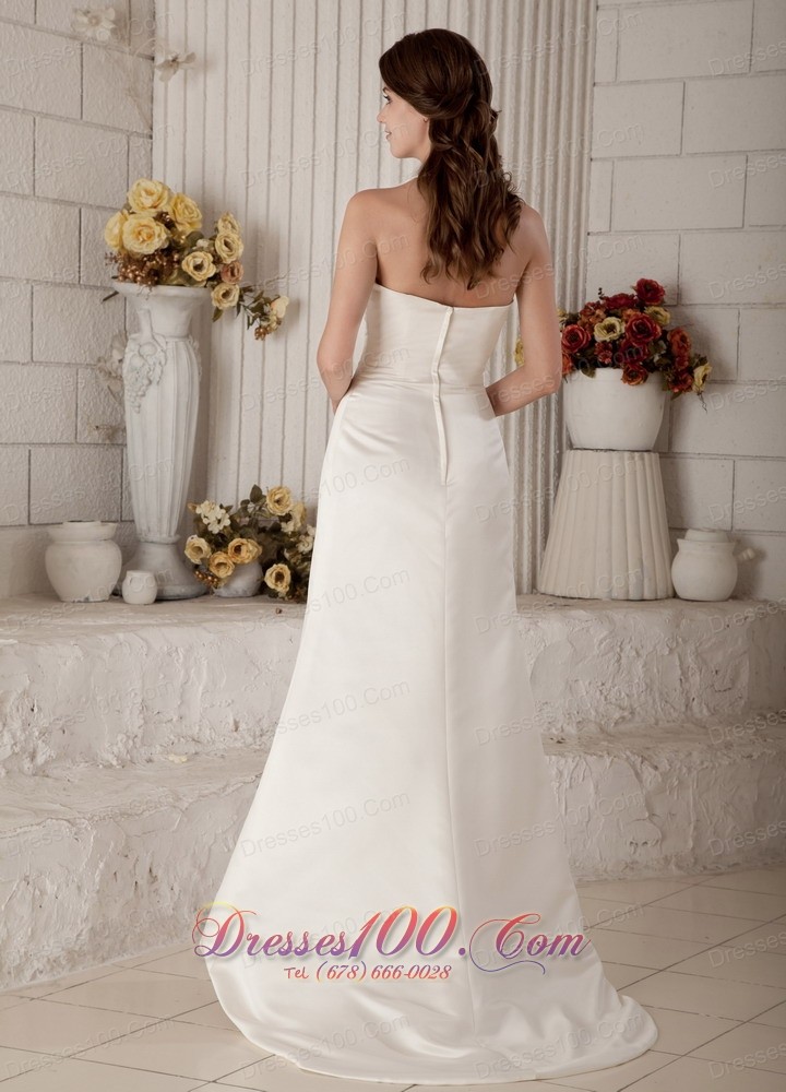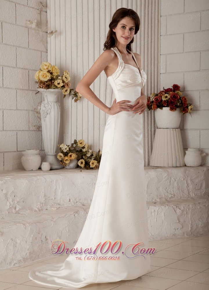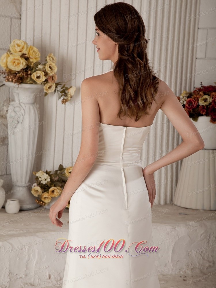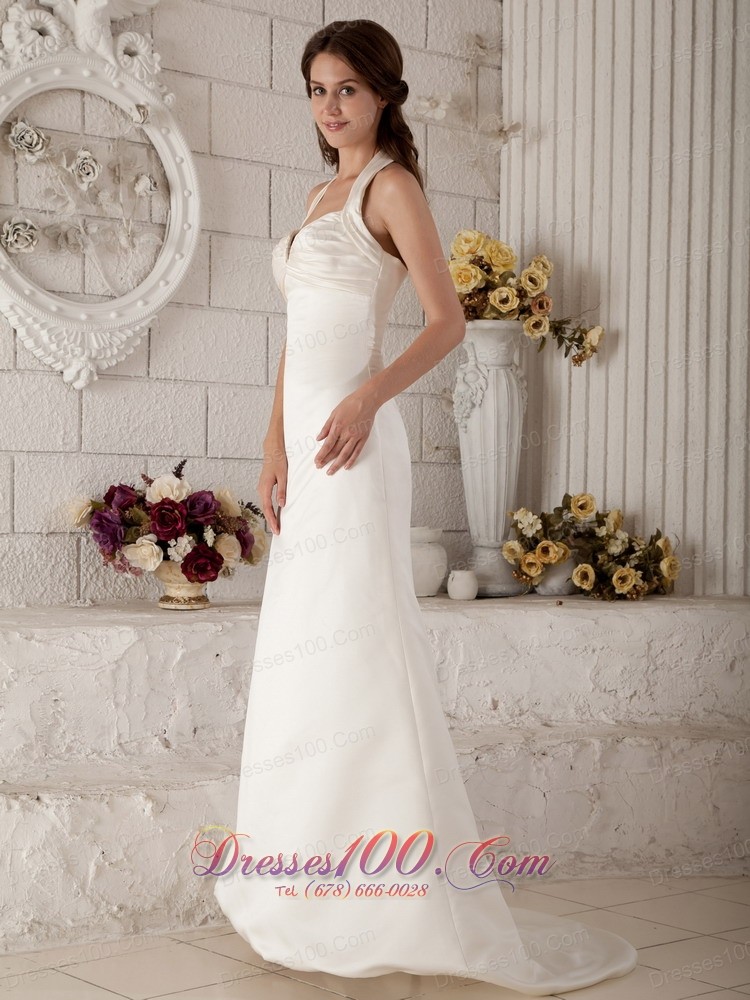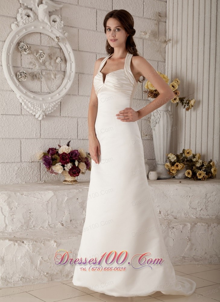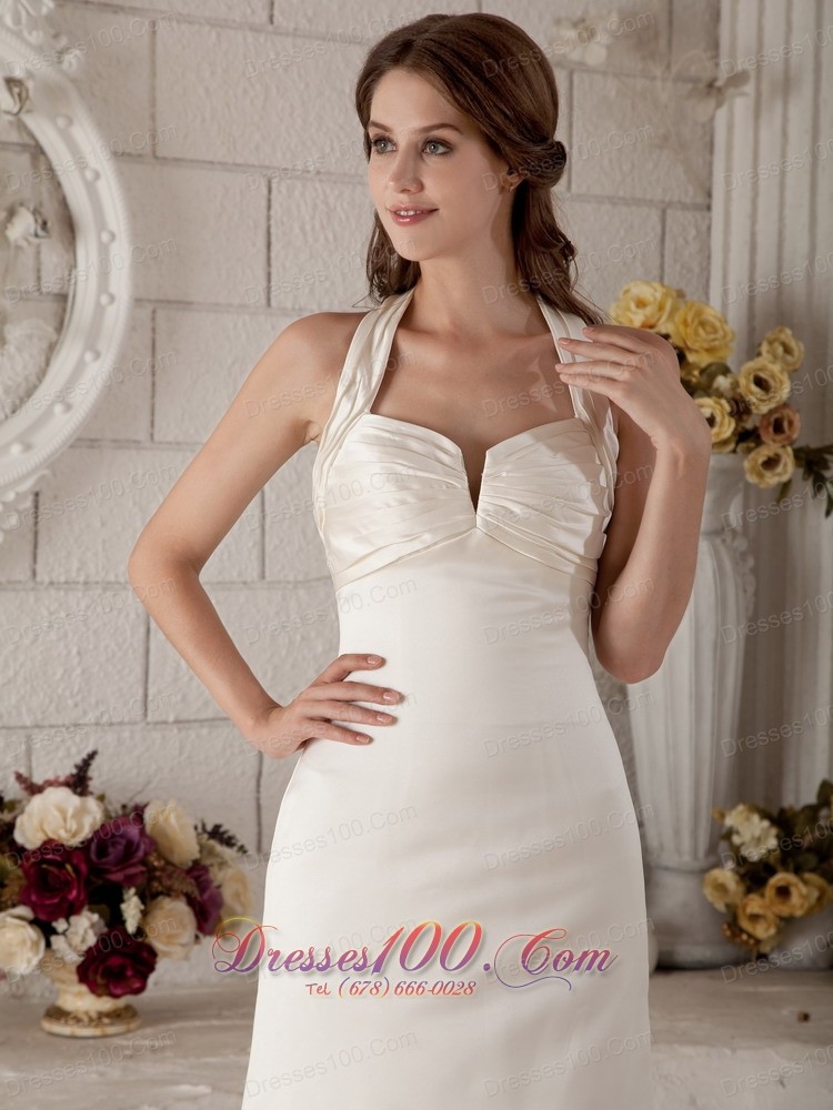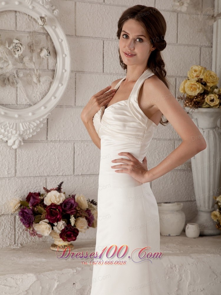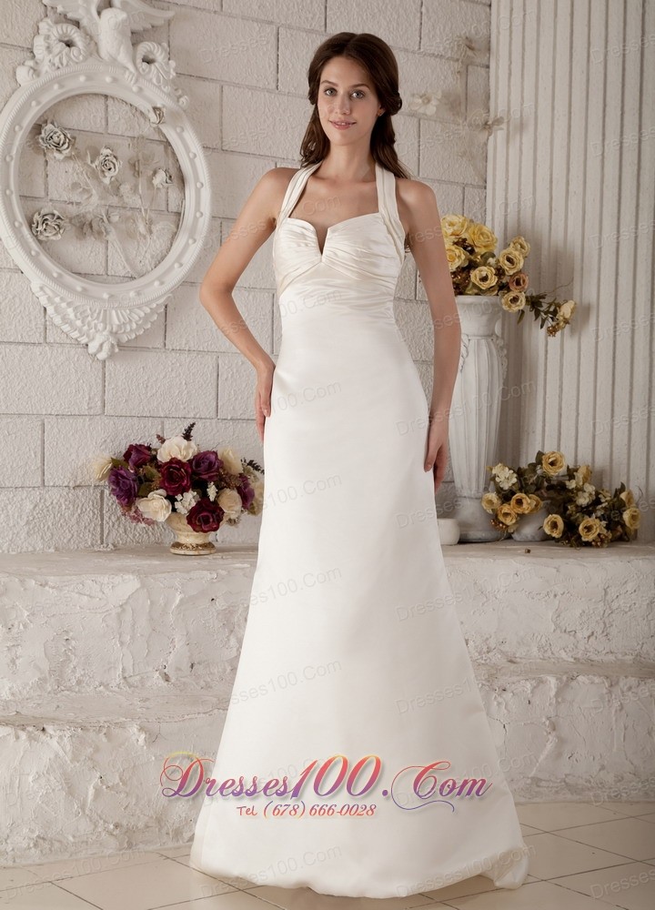 Simple and elegent! A fitted, halter style bodice made of ruches accenting the unique neckline. The combination of the sweetheart neckline and v-neck neckline add the charm of this dress. A hidden zipper makes for easy off and on and secures the dress in place. The slim skirt is complete with a sweep train. You'll be the belle of the ball in this floorlengh white ball gown.