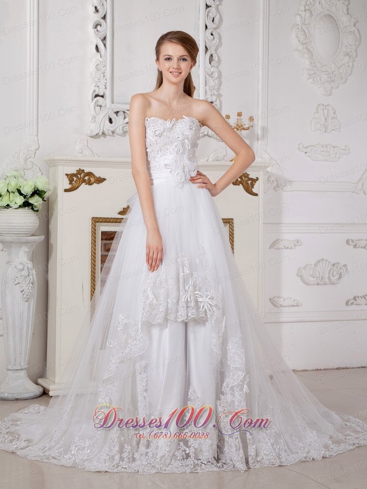 Wow! What a fantastic bridal dress! It features a form-fitted bodice encrusted with shimmery crystals and floral knots embellishments, your slim figure will be emphasized by a pleated wide waistband with the hand made flowers gathered on the side. What's more glamorous is the enchanting floor length skirt in exquisite lace covered with a high-ended out layer in the same lace fabric decorated with the same floral knots. A court train continues the already gorgeous dress more romantic and eye-catching. A lace up closure with a big bowknot on completes a fabulous look.