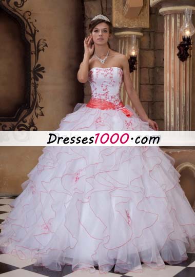 White Strapless Ruffles Organza Embroidery Quinceanera Dress