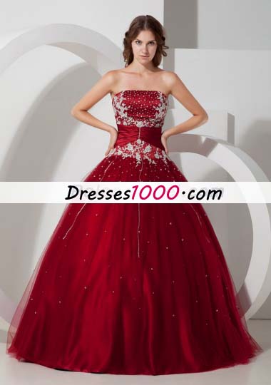 Wine Red Strapless Tulle Appliques 15 Quinceanera Dress