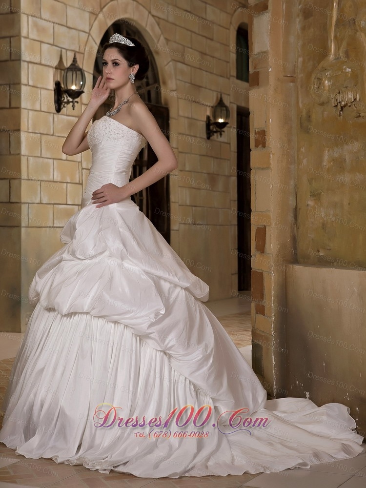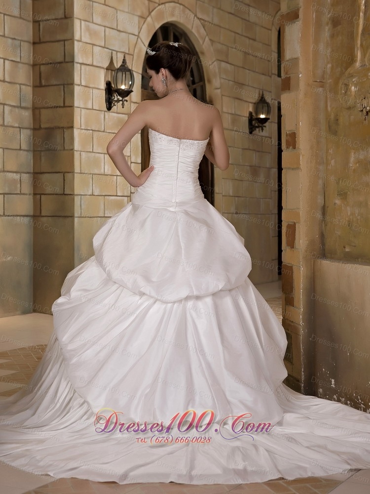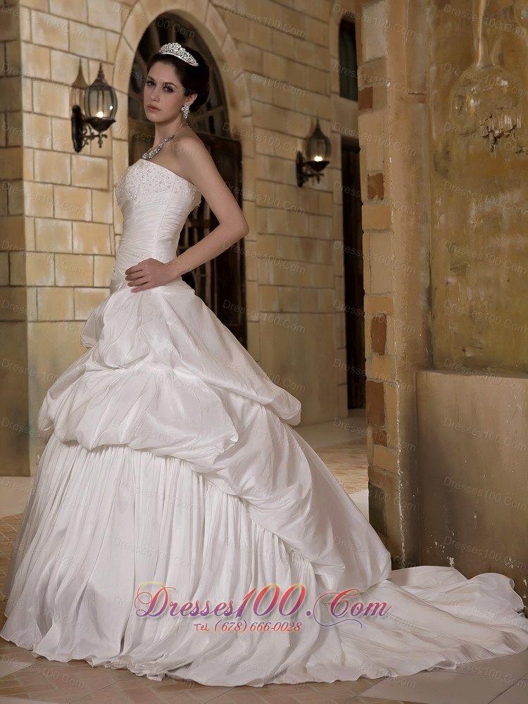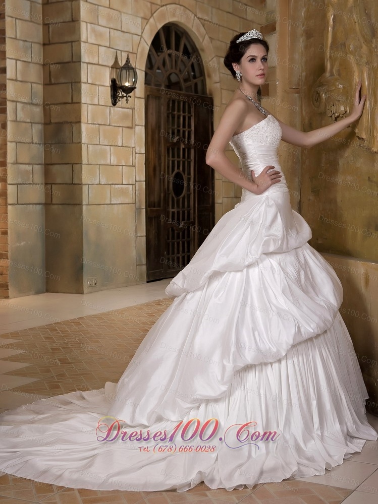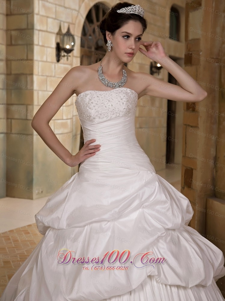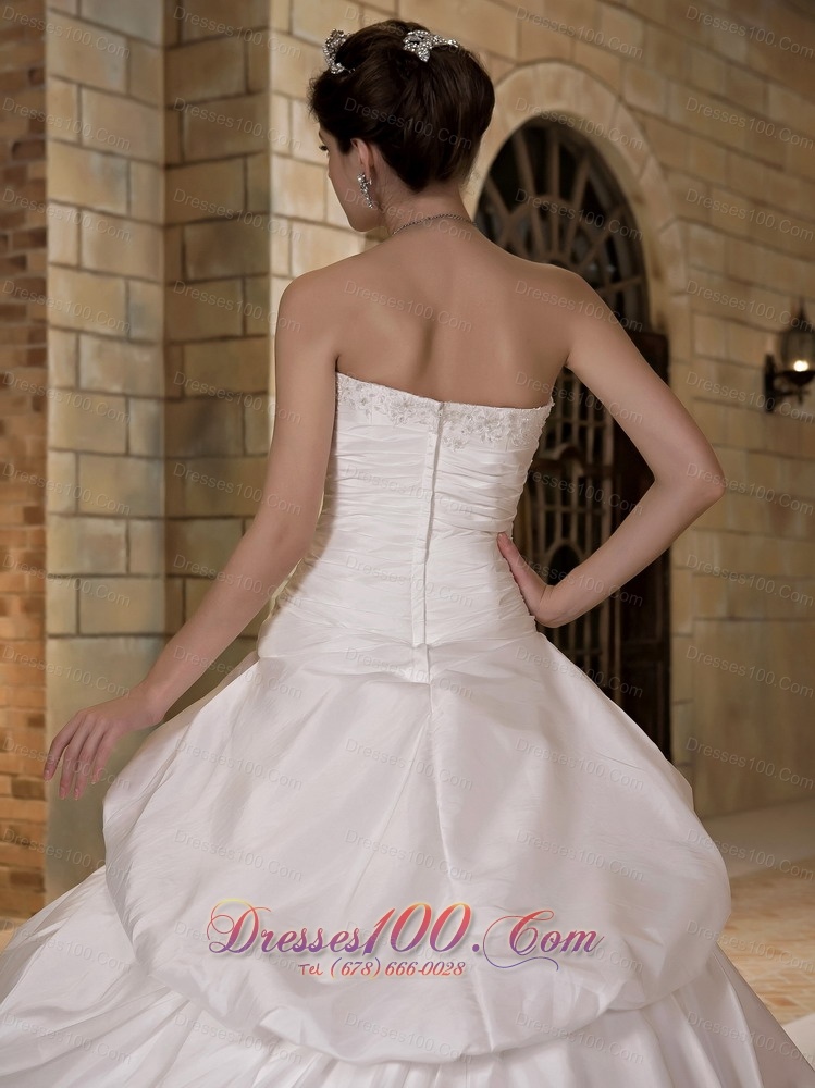 A-line Strapless Court Train Taffeta Appliques Weddong Gown